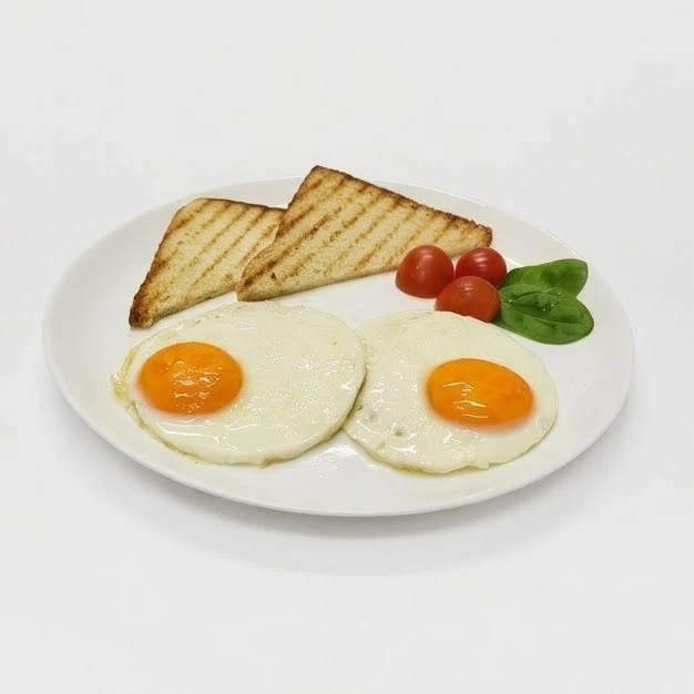 Нежная глазунья из двух куриных яиц, приготовленная на подсолнечном масле, в сочетании с хрустящим пшеничным хлебом.